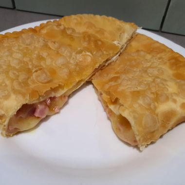 Pastel caseiro com presunto e queijo mussarela feito na hora.